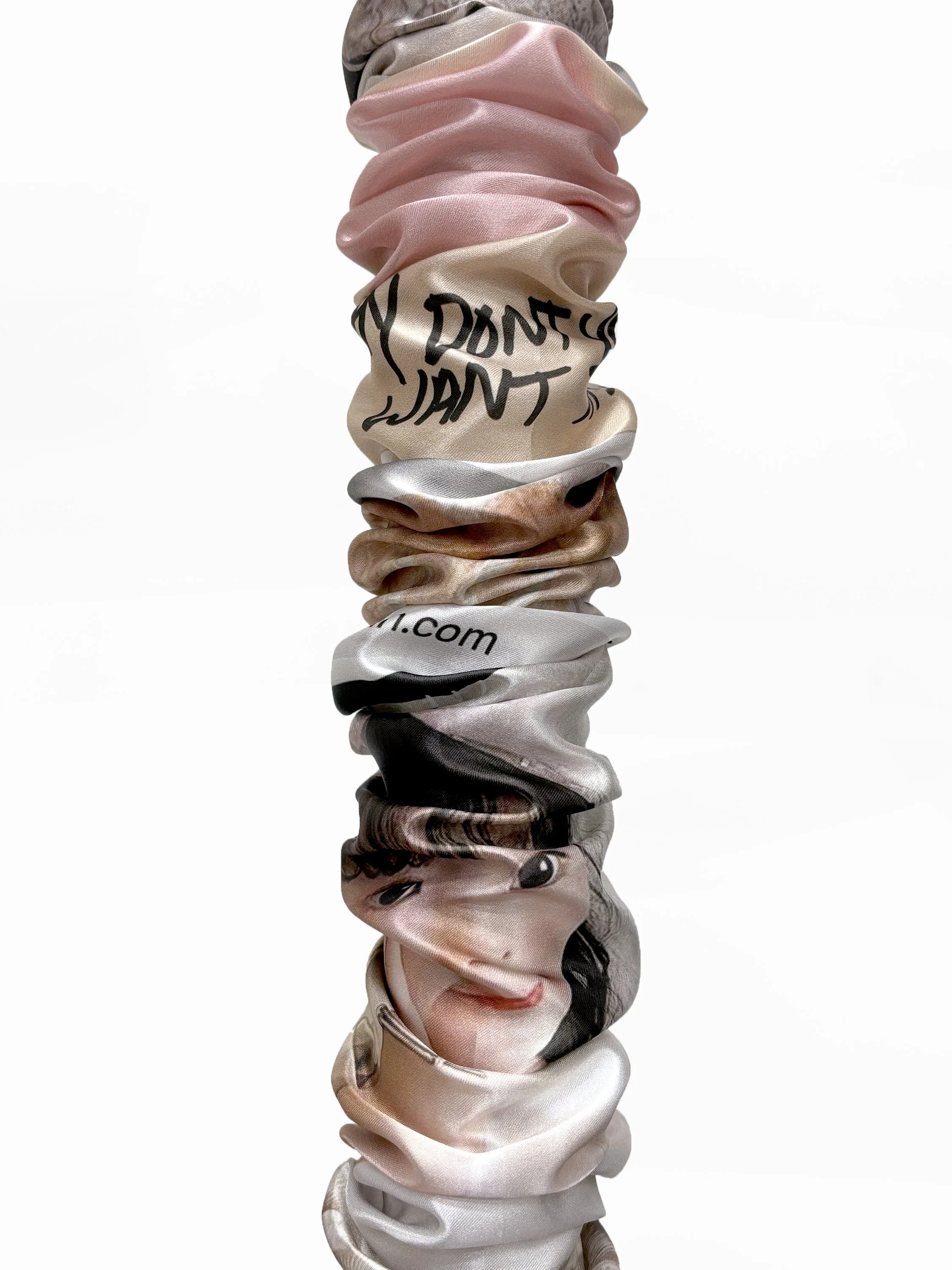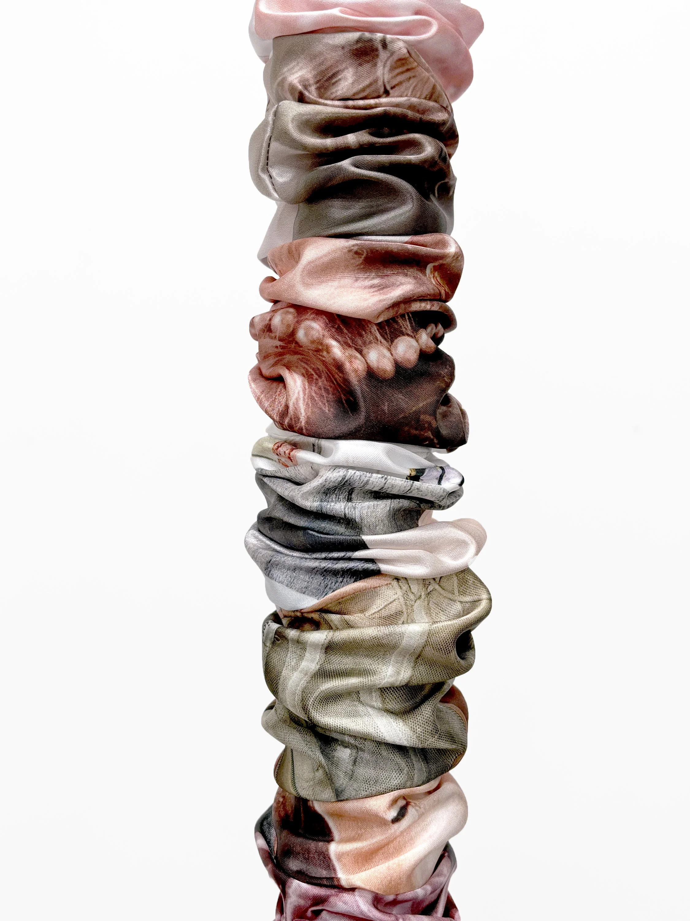 Digital print on ruched satin; cut glass; dried flower petals;